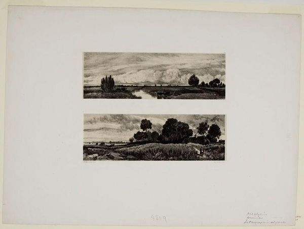 Editor: So, this is "Ved Suså," an etching by Axel Holm from 1912. It's a simple landscape, almost monochromatic, but it has a subtle tranquility that I find appealing. How do you interpret this work? Curator: This piece speaks to me of the complex relationship between humanity and nature, particularly within early 20th-century Scandinavian art. Consider the sociopolitical context: rapid industrialization versus the enduring pull of agrarian life. Does this tranquil scene represent an escape, a form of resistance against encroaching modernity? Or is it a romanticized, perhaps even unattainable, ideal? The quietness almost screams of displacement. Editor: Displacement? I hadn't considered that. I was just thinking about the peacefulness of the countryside. Curator: Exactly. And who gets to experience this peace? Who has access to these landscapes? Was this "peace" built on the dispossession of marginalized communities? We must examine whose stories are being told and whose are being erased through seemingly idyllic images. What perspective do you think is prioritized through Holm’s careful attention to light and shadow? Editor: So, it's not just a pretty picture; it's a reflection of the power dynamics of the time? Curator: Precisely. It invites us to question the very notion of "landscape" as a passive backdrop and consider it as a space loaded with social and historical significance. Art compels us to connect history, culture, and society through what is visualized on the canvas. What stories are *not* shown here? Editor: That's given me a completely different perspective. I'll never look at landscapes the same way again. Curator: Hopefully you will see art as a method to engage critically with history!