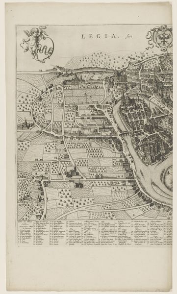 This is Abraham Jansz. Deur's detailed engraving of "Plattegrond van Antwerpen en de Citadel." At first glance, the composition is dominated by a complex network of lines and shapes defining the city's infrastructure and fortifications. Note how the city’s walls, rendered with sharp, angular lines, contrast with the organic, flowing lines of the river. The city and its surroundings are meticulously structured and presented almost mathematically. Deur’s work reflects the broader philosophical and political concerns of his time. Cities were increasingly seen as strategic entities. The visual ordering of space also signifies the imposition of power and control over the urban environment, typical of the era's socio-political landscape. Consider how this map not only represents space, but actively constructs a view of order and power. This cartographic representation serves as both a tool for navigation and a symbol of authority.
