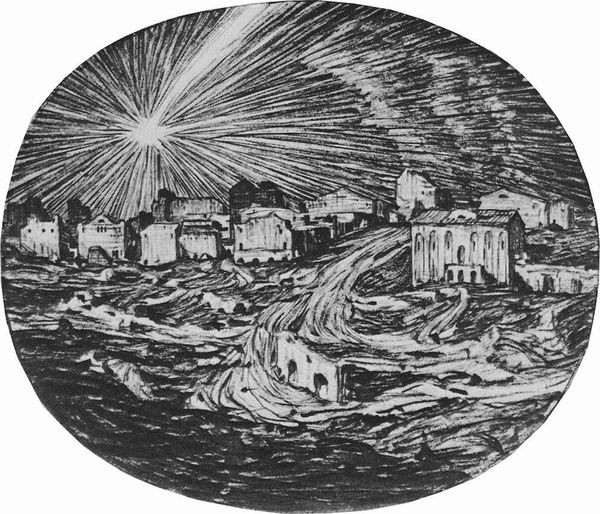 Curator: The brooding quality in this graphite drawing immediately strikes me. The light feels ominous, yet romantic. Editor: We're looking at "Star light" created in 1925 by Konstantin Bogaevsky. He was deeply inspired by the landscapes of the Crimean Peninsula, but I wonder if this specific artwork points towards a deeper exploration into Romantic symbolism. Curator: Indeed. The composition leads our eye upward, toward those intensely radiant starbursts in the sky. Their structure is quite remarkable—radiating lines puncturing the darkness. Bogaevsky is creating a visual hierarchy that asks us to contemplate more than just a simple landscape. Editor: Bogaevsky was working in a post-revolutionary context in the Soviet Union. Many artists turned inward, to more subjective and personal modes of expression given the political and social realities of the time. "Star light", I feel, might reflect this sentiment. It seems to articulate a longing for something beyond the terrestrial. Curator: A longing for the transcendent, certainly. The technical mastery is worth noting; look at the texture he creates with graphite to differentiate the celestial realm from the earthly one, and the contrasting sharpness of details against the softened light. Editor: There is something timeless here. This search for meaning in the cosmos transcends any particular political moment and intersects personal experience with more general inquiries on existence and purpose. Curator: I agree, the power lies in the universal quality of awe and our fascination with light itself. Bogaevsky’s manipulation of light makes this drawing a truly affecting piece. Editor: He understood how to draw the viewers into that quiet space between reality and imagination—making visible those profound yet quiet questions of existence.