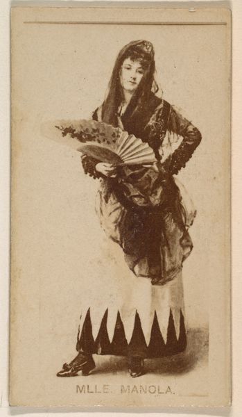 Editor: This is an intriguing piece – a print from between 1890 and 1895, part of the "Actors and Actresses" series by W. Duke, Sons & Co., featuring Lottie Collins. The monochrome and almost sepia tone lends a feeling of antiquity and the figure seems to dance out of history. The dress grabs my attention, its angular designs look really striking! What draws your eye to this portrait? Curator: What fascinates me are the layered meanings embedded within this small image. This seemingly simple portrait is laden with social history. Think about it – this image of Lottie Collins, famous for "Ta-Ra-Ra-Boom-De-Ay," wasn't just art; it was essentially an advertisement included with Duke Cigarettes. Editor: So, it's more than just a portrait. It's also promotional material! Curator: Precisely. It speaks volumes about the period – how celebrity, entertainment, and commercialism were intertwining. And the very act of collecting these images was a social phenomenon, creating shared cultural touchstones through consumerism. Editor: I hadn’t considered the cigarette cards themselves as a cultural artifact. Does Lottie Collins, or even "Ta-Ra-Ra-Boom-De-Ay" have deeper symbolic resonance? Curator: Absolutely. The song itself was scandalous for its time – exuberant, suggestive, a celebration of freedom and perhaps even a challenge to Victorian prudery. Collins, by embodying this song, became a symbol of liberation and female agency, circulated through these mass-produced images. It's interesting that she is portrayed as this free-spirited, confident woman who challenged conventional notions of womanhood, further challenging us to reconsider ingrained ideas about memory and tradition. Editor: I guess I’ll never look at cigarette cards the same way again. This little card unlocks such a vast history. Curator: Indeed. And it highlights the enduring power of images to capture and transmit not just appearances, but entire worlds of meaning.