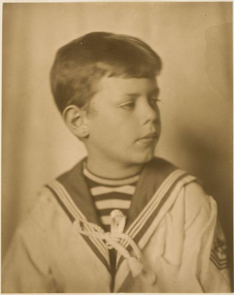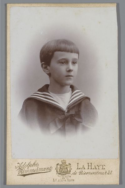 Carel Frederik Cordes made this tiny portrait of Gerard Herman Broos, who was six years old at the time. It’s a photograph, so it’s all about capturing light, shadow, and the subtle variations in tone. The image is sepia, almost monochromatic, but that doesn’t mean it lacks depth. The way Cordes plays with light across Gerard’s face and sailor suit creates a sense of volume and texture. It’s interesting how the softness of the child's face contrasts with the sharp lines of his collar. This little detail, the white trim of his sailor suit, just pops, doesn't it? It's amazing to think that photography, like painting, is also about creating an illusion of depth on a flat surface, through careful arrangement of light and dark. This portrait makes me think of early Man Ray, who also loved experimenting with light and shadow to create a sense of mystery and intrigue. It shows how art is an ongoing conversation, with artists building on each other's ideas across time.