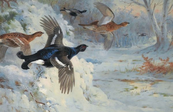 Archibald Thorburn created this watercolor painting, “Pheasant In Flight." Thorburn was a Scottish artist, who specialized in wildlife painting, particularly birds. His art developed in the late 19th and early 20th centuries, a period of significant environmental change and growing awareness of conservation issues, influencing his commitment to capturing wildlife in its natural habitat. The emotional and personal dimensions of this artwork invites reflection on our relationship with the natural world, and the changing status of rural life and its wildlife in modern society. The painting can be seen as part of a tradition where wildlife art often romanticizes nature and rural settings. Through his skilled rendering, Thorburn immortalizes a fleeting moment of nature, inviting viewers to contemplate the beauty and fragility of the natural world.