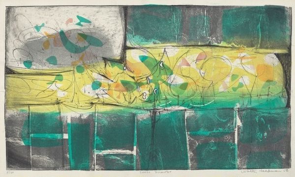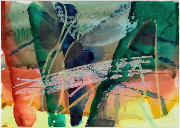Curator: John Cage created "New River Watercolor, Series I, #5" in 1988. Editor: My immediate reaction is a feeling of quiet introspection, and a certain sense of underlying tension through the use of bold lines. The color palette, dominated by earth tones, amplifies that mood. Curator: It is fascinating to consider Cage's body of work during this period and how his performance art and social activism influenced this piece. While we cannot ignore its aesthetic qualities, it is crucial to consider his commitment to decentralization. Editor: I agree with your observation. Yet I'm compelled by the intentional ambiguity in its structure. Cage balances these opaque rectangular areas and open brushstrokes that create a push and pull across the work. Curator: Perhaps this also represents Cage's philosophical approach to destabilizing norms—offering, in material form, new configurations of how we perceive established concepts. In terms of the aesthetic, this aligns perfectly with how he disrupts traditional understandings of identity. Editor: An important element is certainly the balance of seemingly chaotic gestural brushstrokes with deliberate composition. Note the thin washes contrasting thicker applications of pigment. Semiotically, these suggest many layers of meaning, don't you think? Curator: Indeed. As an artist deeply engaged with process and chance, Cage sought to dissolve the figure-ground relationship and to allow each element—color, line, texture—equal significance. That aligns closely with many philosophical stances taken against hegemonic views. Editor: And his exploration of unconventional materials pushes these dialogues even further, revealing how the materiality embodies the idea, too. It’s a powerful interaction! Curator: Agreed. The tension of lines and colors reflecting back Cage’s own struggles with issues of freedom, constraints, and individuality. Editor: Absolutely, bringing it back to your points around sociopolitical ideas—it allows the artwork's formal and conceptual features to mutually elevate its communicative powers. Curator: Viewing the work this way expands our understanding and, ideally, empowers us. Editor: A thought-provoking piece, certainly, when we allow visual details to enrich contextual layers.
