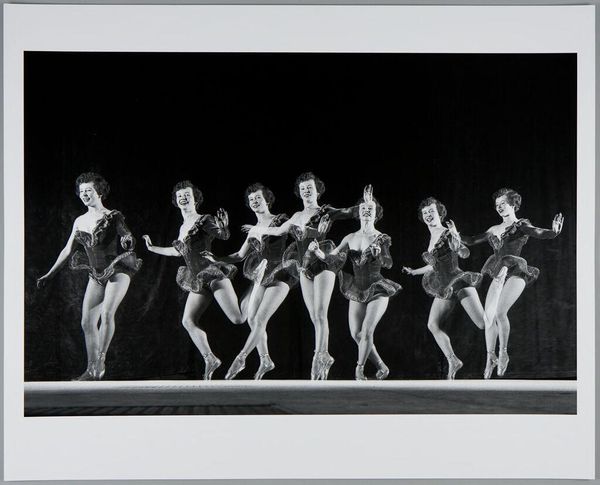 Editor: This is Jack Gould’s "Untitled (line of women dancing on stage)," a small, intriguing photograph. It feels like a fleeting moment captured, but I’m unsure what to make of the inverted tones. What's your perspective? Curator: It’s fascinating to consider what this image reveals about the representation of women in performance. The inversion highlights the artificiality of the stage, doesn't it? It prompts us to question the labor and constraints imposed on these dancers, even amidst apparent joy. Editor: So you see the inversion as a way to highlight those constraints? Curator: Precisely! It disrupts the expected glamorous image, potentially critiquing the objectification inherent in such displays. What does their synchronization suggest about individual expression versus conformity? Editor: I never considered the darker tones in that light. It makes me think about the power dynamics at play. Curator: Exactly, and how art can unveil societal structures!