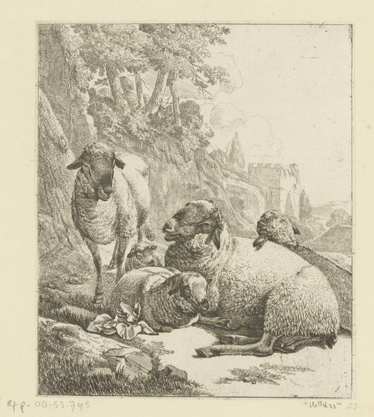 Johann Heinrich Roos made this etching, Vier liggende en een staand schaap, using metal and acid in the 17th century. The print presents us with a bucolic scene of sheep in a field. But let’s consider the labor involved in the production of an etching like this. First, the artist would have had to prepare the metal plate, then carefully draw the composition using a needle-like tool, exposing the metal. Next, acid is applied to ‘bite’ into the exposed lines, creating grooves that will hold ink. The plate is then inked, wiped clean, and pressed onto paper, transferring the image. The precise control needed speaks to the skill Roos possessed. Roos was celebrated for his animal paintings, and there was a booming market for such pastoral scenes among wealthy city dwellers. Understanding the labor and skill involved in the etching process gives us a deeper appreciation for Roos’s work, and its place in a wider economic picture.