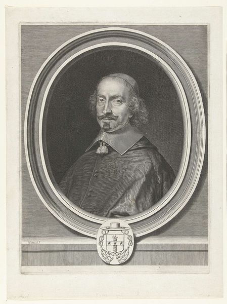 Curator: Ottavio Leoni created this engraving of Giovanni Battista Marino. I am struck by the cross hanging from his neck; it hints at a tension between worldly pursuits and spiritual devotion. Editor: It's a compelling portrait. My first impression is one of guarded ambition; the lace collar almost feels like a barrier, and there's a formality to his gaze. Curator: The oval frame itself symbolizes containment. Marino was a celebrated poet, known for his sensuous verse, yet here he's presented with emblems of nobility and religious fealty. Editor: Right, we see these visual codes of status, while his poetry challenged social norms of his time. The portrait then becomes an exercise in managing perception. Curator: Perhaps Leoni, with this strategic use of symbolism, is showing how Marino navigated those complex social currents. Editor: Yes, and it reminds us that identity, even in art, is always a negotiation between self-expression and societal expectations.