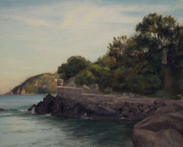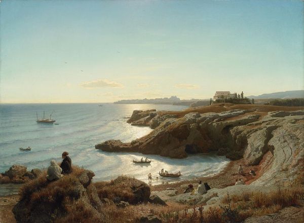 Curator: Anders Christian Lunde offers us "Strandparti i nærheden af Tårbæk," or "Beach Scene Near Tårbæk," believed to have been created between 1824 and 1886. The artist employed oil paint on canvas to capture this landscape. Editor: My immediate reaction is one of tranquil observation. There’s a certain luminescence in the sky that casts a golden glow upon the sandy bluff. Curator: Indeed. Lunde’s masterful manipulation of light and shadow is readily apparent. Observe the meticulous rendering of the clouds. Notice, as well, how the composition adheres to classical principles, grounding us in a sense of balanced space between land, sea, and sky. Editor: Absolutely, and if we consider the context of plein-air painting at the time, what could seem to be simply representing a Danish coastal area transcends this straightforward realism? Are we sure, for instance, of what activities might have filled the lives of people who lived along this beach at that time? Who are the passengers on that boat? I wonder what realities are missing here, too. Curator: A valid point. Yet it is essential to appreciate Lunde's formal accomplishment. He deploys visible brushstrokes to give texture, and his atmospheric perspective provides considerable depth, even though the overall mood appears unassuming. Editor: But isn’t that mood complicit? By offering us the surface pleasures of leisure without showing laborers or struggles, is he not giving his viewers an image free of disruption or contest? I think about gender, too—the ways that spaces have different connotations depending on who occupies them, what they mean for one person as opposed to another. The artist may also invite scrutiny concerning their social perspectives. Curator: It appears Lunde endeavored to represent the shoreline as accurately as possible; still, I believe his approach may lack complete verisimilitude regarding the lives and communities present during that period along the Tårbæk. It might lead us to inquire how our modern expectations might impact our appreciation. Editor: Precisely! Thank you for helping explore all angles! Curator: You have been heard and understood, indeed!