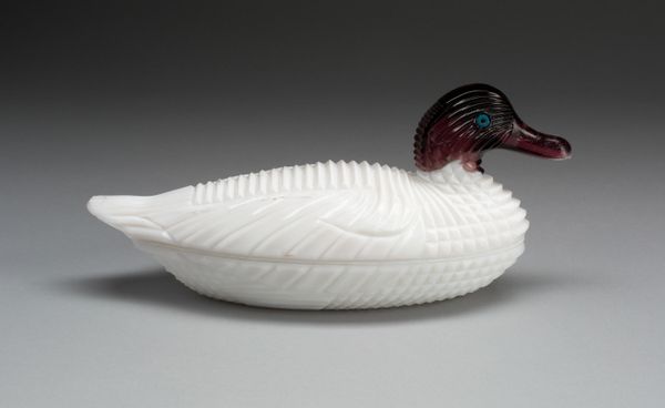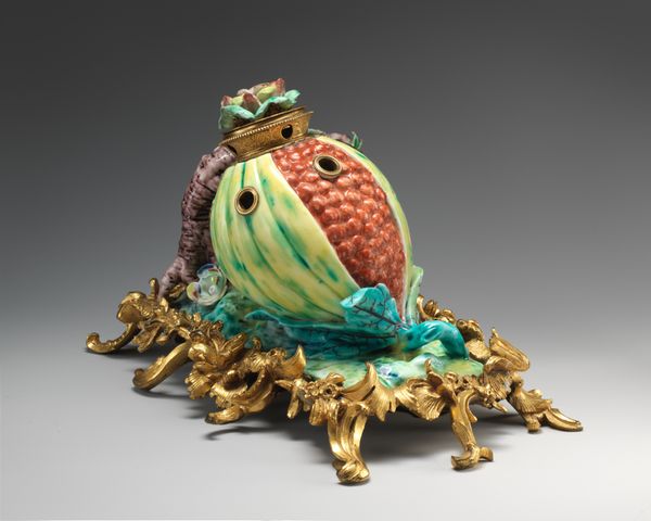 Curator: Well, that's... intense. It’s a Fighting Cock, quite literally. All angles and aggression. Editor: Indeed! What strikes me immediately is the exquisite detail of the feathered surface. Notice how the porcelain, expertly crafted by the Chelsea Factory around 1755, captures the bird's plumage with incredible precision and texture. Curator: The question I have is, who thought this was appropriate dinnerware? Or rather, what statement was being made by serving something out of this vessel? Consider the Rococo period. Excess, theatricality, power…it’s all there. It isn’t just a pretty porcelain bird; it's a symbol of aristocratic display. Editor: From a formal perspective, it's the dynamism that captivates. The sharp angles, the vibrant yet somewhat muted palette…it all leads your eye across the form. Notice the contrast between the smoother body and the meticulously rendered head, almost confrontational. It has an amazing balance. Curator: And a somewhat brutal kind of humor, no? Cockfighting was a popular, albeit brutal, entertainment among the gentry. Perhaps this tureen is an ironic commentary. Were they celebrating dominance and aggression even as they dined? Was this making fun of their interests? Editor: It’s really quite interesting how the sculptural form imitates nature. Observe the way light plays on the glazed porcelain, almost mimicking real feathers. Curator: Exactly. Though, nature carefully managed, controlled, and put to the service of wealth and privilege. So much more than just a pretty bird. Editor: Absolutely. It highlights how technical skill can imbue functional items with incredible artistry, even when representing, ah… pugnacious subjects. Curator: So next time you're at a dinner party and the tureen looks angry, think about the layers of social and political meaning potentially simmering beneath the surface. Editor: A fittingly complex end note. Art serves so many facets. Thank you.