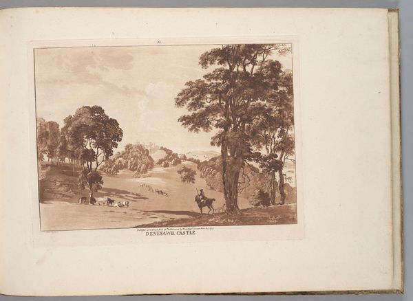 Curator: This is Paul Sandby's "Chepstow Castle", a print rendering the eponymous fortress. There's a lovely pastoral scene occupying the foreground... Editor: It's gentle, almost wistful. The sepia tones lend it a nostalgic air, like a faded memory of a picnic long past. Curator: Indeed, Sandby was a master of aquatint, a printmaking technique that mimics the look of watercolor. He really exploits its tonal range here. Look at how the light filters through those trees! He probably used nitric acid and resin to etch the plate. Editor: It really softens the architecture; the castle feels less like a symbol of power and more like another element in the landscape, a quaint ruin for contemplation. I wonder about the people depicted, are they enjoying leisure afforded by industry? Curator: Perhaps. Sandby was fascinated by the picturesque, finding beauty in the everyday. I always feel a kind of serene detachment when I look at this piece, a quiet invitation to pause and reflect. Editor: Absolutely. It prompts us to consider our relationship with both nature and history, and the way they’re interwoven.