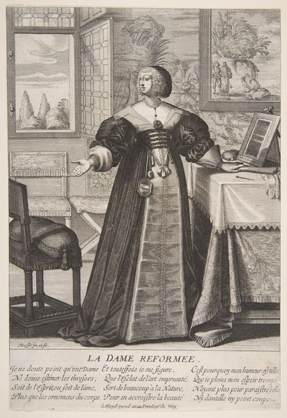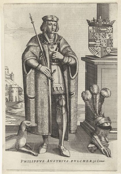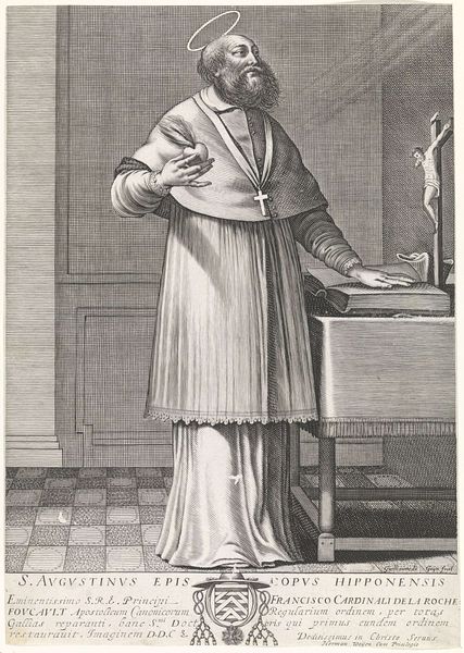 Editor: So, here we have a portrait of Jacobus Arminius, an engraving by François Stuerhelt, dating sometime between 1643 and 1698. The subject's severe expression makes me wonder what was happening politically or religiously when this was made. What strikes you about it? Curator: Immediately, I see the assertion of status typical of Dutch Golden Age portraiture. But it's the overt display of wealth and learning, meant for a broader public beyond Arminius's immediate circle that's key. Look at the open book, the fur-lined robe. Those signal erudition and affluence, tools to persuade a larger community to respect and listen to him. Who was his audience, and what messages did he want them to believe? Editor: So you're saying the portrait functions almost as a political advertisement? Curator: Precisely! Engravings like these circulated widely. It invited viewers to contemplate Arminius's theological positions during a time of intense religious debate. What does his gesture toward the book communicate to the contemporary viewer? Editor: Hmm, maybe an invitation to engage with his ideas directly, rather than relying on interpretations? The globe behind him seems like a signal that his ideas were relevant to a broad population, maybe worldwide? Curator: Excellent. It suggests the universality and import of his theological contributions. And think about the institutional context: how did engravings like these help construct and perpetuate a specific image of Arminius within religious and intellectual circles? Who controlled the dissemination, and how did this influence interpretations of his life and work? Editor: That's fascinating. I hadn't considered the role of art in shaping reputations and ideologies beyond the individual portrayed. Curator: Understanding the socio-political context allows us to view this image as more than just a likeness, it reveals a carefully constructed public persona.