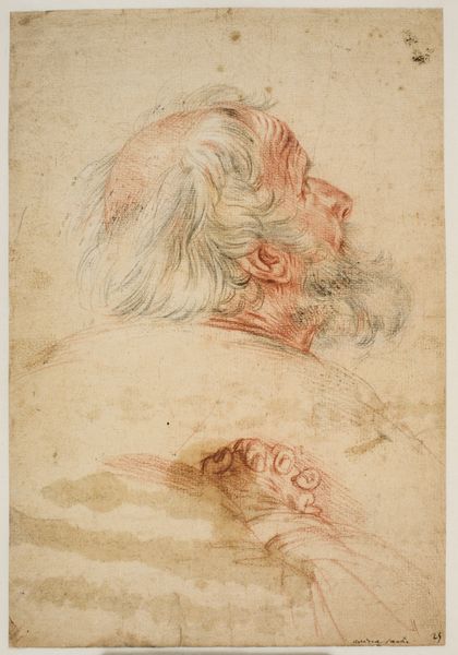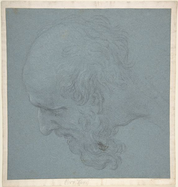 Curator: Before us, we have Charles-Joseph Natoire's "Head of a Sea God," a charcoal drawing likely created sometime between 1730 and 1740. Editor: Ah, yes! Immediately, I see the grandeur. It's like looking at a storm brewing in someone's thoughts, isn’t it? Such expressive, swirling lines… it feels both ancient and intensely alive. Curator: Precisely. Natoire was quite skilled at capturing the dynamism of the Baroque while moving into the more decorative Rococo style. Notice the delicate shading that gives such depth to a relatively simple portrait. Editor: It's that contrast—the softness against those almost violent charcoal strokes—that grabs me. It’s a beautiful conflict. The foliage crown adds to the visual complexity; like thoughts sprouting unpredictably. It’s the mind of the sea! Curator: Indeed. In formal terms, the artist’s use of chiaroscuro—the strong contrast between light and dark—contributes significantly to the dramatic impact. It directs our eye and adds weight to the figure’s expression. The loose sketch-like approach imbues the piece with energy. Editor: You know, it makes you wonder what this sea god is contemplating, doesn't it? The fate of ships, maybe, or just the sheer, endlessness of water. Is it a portrait of Neptune? Perhaps, a study. But there is vulnerability there that I find so compelling. Even gods, it seems, have their pensive moments. Curator: And that is a wonderful observation. By studying the work in detail, we note how Natoire subtly deviates from idealized depictions, adding humanity, emotion… a touch of character. This pushes it beyond a mere study or exercise, turning it into an insightful character study. Editor: Absolutely. It's a refreshing reminder that even something centuries old can still feel incredibly… well, current. Thank you, Neptune or whoever you may be, for lending us a bit of your profound silence!