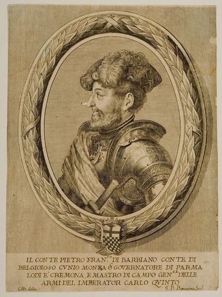 This engraving portrays Giovan Luigi Vitelli and was created by Arnold Loemans. The portrait presents Vitelli, a military figure, framed by symbols of war and victory. The stern expression of the man and the militant paraphernalia are indicative of his status as a figure of power. But who decides who the heroes are? How are they remembered? Consider the historical context of the artwork. Vitelli’s identity as a military leader is emphasized, which reflects the values of a society often structured around military power and conquest. By focusing on his military achievements, the artwork reinforces a specific narrative of masculine identity that equates power and authority with military might. This image is not merely a portrait; it's a statement about power, legacy, and the way history remembers its key players.