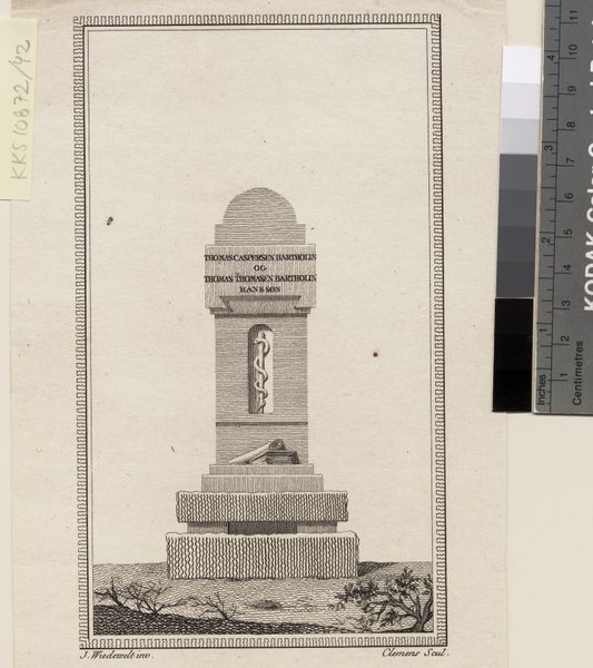 J.F. Clemens made this print of Arngrimur Jonsson sometime before 1831. It is an engraving, made by incising lines into a metal plate, inking the surface, and then using a press to transfer the ink onto paper. The image is a memorial to the Icelandic scholar Arngrimur Jonsson. This type of printmaking was ideally suited to the creation of widely distributed images. It played an important role in circulating information and ideas. The linear precision of the engraving technique lends itself well to architectural representation. The monument is presented as a stoic marker in the landscape, a testament to Jonsson’s enduring legacy. Engravings like this one were part of a much larger print industry. It was one that relied on skilled artisans to translate designs into reproducible images. The print’s effectiveness lies in its ability to convey a sense of permanence and authority through the careful manipulation of line and form. It underscores the vital connection between the means of production, cultural memory, and the democratization of knowledge.