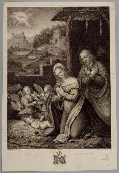 Curator: This is François de Poilly the Elder’s “Holy Family with the Cradle,” currently housed in the Harvard Art Museums. The print presents a tender domestic scene. Editor: There's a compelling visual balance in the composition, creating a tranquil and contemplative mood. Curator: The printmaking process itself highlights the accessibility of religious imagery during that time, circulating ideals through readily produced items. Editor: Note the contrasts in texture achieved through the etching. From the smoothness of the skin to the rugged landscape, these details add depth. Curator: The image could reflect specific social values and gender roles of the era— the focus on motherhood as both sacred and central to family life. Editor: Indeed. Reflecting on the composition, Poilly uses a pyramidal structure to center the Holy Family within an idealised landscape. Curator: It's intriguing how such imagery could both support and challenge societal norms through its symbolic power. Editor: It does leave us to consider the enduring appeal of such archetypal forms and narratives.