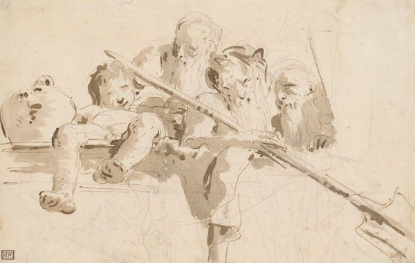 Curator: This drawing, “Sole figure per soffitti,” is attributed to Giovanni Battista Tiepolo. Created with ink and charcoal on paper, it exemplifies the Baroque style and thematically revolves around figuration, typical of genre-painting. Editor: Hmm, there's an ethereal quality about it. They seem to float in the pale wash, lost in thought, or maybe just waiting for something to happen. It feels intimate, even unfinished. Curator: Indeed. While the title translates to "Single Figures for Ceilings," we see here not a singular figure but a group, which adds to the depth and invites an examination of their relationship, their shared space. The quick, expressive strokes suggest a preparatory sketch. Perhaps these figures were intended to populate a grander narrative. Editor: A study, then? That explains the raw energy. I can almost hear the scratch of the charcoal, the quick decisions being made about weight and form. There’s this very strong suggestion of form – I mean, it's figuration in the purest sense – but rendered almost… tentatively. The negative space breathes around them. Curator: The Baroque, as a movement, loved drama and dynamism. Even in a study, the weight and expressive postures point towards that aesthetic. I see in their gestures, particularly in the figure holding what appears to be a staff or shovel, echoes of classical mythology. This merging of everyday folk with a grandeur narrative arc... it speaks to the period’s fascinations. Editor: The tool adds an earthy weight that's an interesting counterpoint to the lightness of the figures. It almost roots the composition, but I agree with you. They’re not quite of the earth. This feels like a memory surfacing – a dream caught in sepia tones. It reminds me how our lives are shaped by fleeting glimpses of figures who might seem ordinary but are also quietly profound, if only we stop to notice. Curator: Perhaps, the drawing holds echoes of the viewer's experience of perceiving and remembering fragments. We carry these pieces; in turn, the drawing evokes the fragmented nature of our perceptions. Editor: Nicely said! It also strikes me that maybe this dream quality— this almost weightless affect, also captures something vital from that period, the early stirrings towards something lighter. Curator: A lovely way to interpret this sketch indeed. Thanks for the chat! Editor: Thank you, until our next visual pondering.