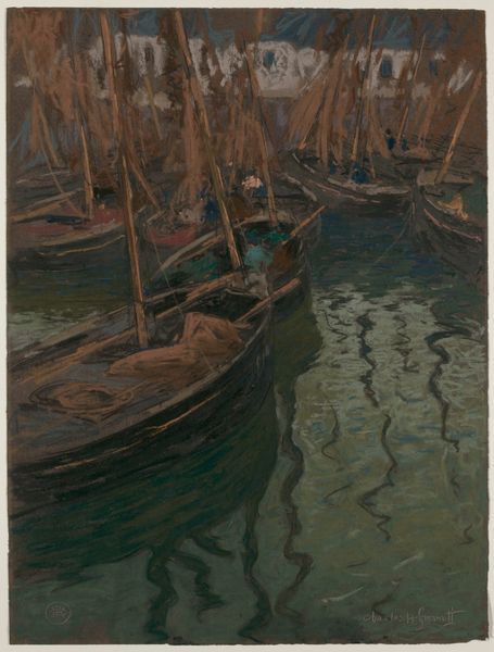 Editor: This watercolor, "Ships at the Dock," was completed by Dora Louise Murdoch in 1893. It depicts, well, ships docked in a harbor. The light feels diffused and creates a somewhat somber atmosphere. I’m interested in your take; what strikes you most about this work? Curator: It's a seemingly simple composition, isn't it? However, consider the layering of washes and the artist's control of transparency. Notice how Murdoch has used the white of the paper itself to create highlights and to define form. What effect does that choice produce? Editor: It makes it feel… lighter? The way the light reflects off the water is really nice because of that. The masts and rigging are so delicate too. Curator: Precisely. The artist achieves a remarkable level of detail and conveys depth effectively through variation in tone and precise linework in the rigging, juxtaposed with the broad strokes that define the ships' hulls. See how those darker, solid forms advance? It yields an image that isn't striving for photographic realism. Editor: So it's less about trying to perfectly represent the ships, and more about how the elements come together? I hadn’t considered how the dark versus light play here, or how it guides my eye across the piece. Curator: Exactly. It's a careful exercise in manipulating form and value within the chosen medium. I invite the viewer to appreciate the controlled yet expressive application of pigment. Editor: I’ll definitely keep an eye out for that contrast between the form and light next time I see it. Thanks! Curator: My pleasure. It has been enlightening to discuss Murdoch's artistic intention and material exploration in her watercolour piece, considering the dynamic between forms and medium, to create a structured aesthetic experience.