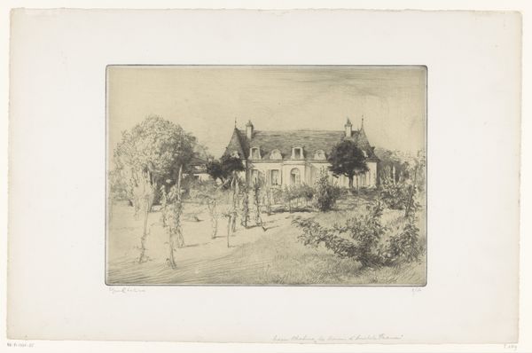 Curator: This etching is titled "Rivieroever met huizen," which translates to "Riverbank with Houses," by Eugène Cicéri, created in 1854. It’s part of the Rijksmuseum collection. Editor: There’s a quiet charm about this scene. The houses huddled together, mirrored in the still water. It feels intimate, almost like eavesdropping on a small town's reflection. Curator: I think that feeling comes, in part, from Cicéri's skill in capturing a very specific atmosphere. Look at the realism combined with romanticism in the way he depicts daily life right at the waters edge, it evokes a deep sense of nostalgia. Editor: You’re right, the buildings are realistically rendered, but there’s also this gentle, almost dreamlike quality to the light. The subtle use of tone and shadow almost imbues the riverbank with its own unique history. Curator: What I find compelling is the visual tension between nature and culture here. See how the row houses seem organically connected to the river’s edge, almost growing out of it. The visual motifs that really standout for me include dwellings on water and along rivers— it indicates constant cultural innovation with natural limitations. Editor: The presence of the people in the small boat certainly enhances that, reminding us that rivers have always been arteries for transportation, trade, and cultural exchange. Did the artist have particular social themes in mind, given it was completed shortly after a period of French revolt? Curator: Certainly, although it's less direct critique and more subtle commentary. Perhaps the etching points to Romanticized longing for a pre-industrial state. In any event, you can detect his perspective as aligned with common European artistic inclinations in those politically turbulent times. Editor: It gives one a strong impression of daily, bourgeois European existence along the banks. The focus on everyday dwellings certainly shows something about cultural pride that transcends even a period of civil unrest. Well, this image has provided a lot to chew on. Curator: Indeed. It reminds us how artistic scenes may invite deeper cultural insight than the aesthetic surface.