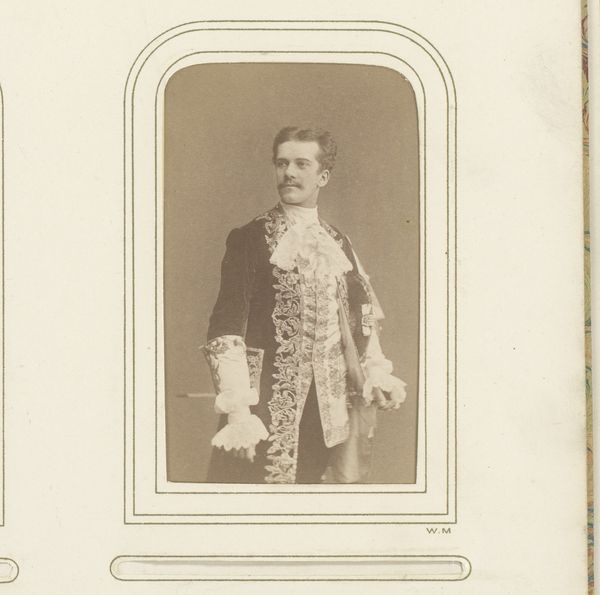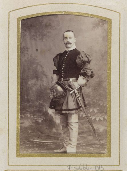 Curator: I am immediately struck by the opulence, and yet, it feels…distant. There’s something inherently performative in this type of staged photography. Editor: Indeed. Let's delve deeper. This daguerreotype, titled "Portret van een (vermoedelijk) Nederlandse militair, staand met sabel en cape," depicts what is believed to be a Dutch military officer. The piece dates roughly between 1886 and 1901 and is credited to Johannes Gesterkamp Jr. Curator: A daguerreotype. The materiality of the process is crucial here, of course. Consider the labor involved in each delicate step, from preparing the silvered copper plate to meticulously developing the image with mercury fumes. This isn't simply "taking" a picture. It's painstakingly crafting one. Editor: Precisely! The sheen and almost ghostly quality inherent in daguerreotypes add another layer. Look closely at the cape, how it drapes; its fabric catches light irregularly, suggesting perhaps a cheaper weave imitating higher quality textiles, thus implying complexities around access, class and imitation. Curator: And consider the very intentional pose—rigid, formal, almost mannequin-like. The semiotics of military attire are powerful; each button, the fur trim, speaks to status and hierarchy. There’s a visual grammar at play, composing notions of power and respect, it’s clearly intended for a certain reading of Dutch national identity, and what masculinity means. Editor: I wonder though, was the uniform custom-made, tailored for precision, or was it sourced from a military surplus depot? The material production of such a garment impacts our reading; one reflects privilege and bespoke luxury, while the other speaks to mass manufacturing serving military demand, labor specialization and material standardization. Curator: That's an insightful consideration of production practices within 19th century Netherlands! The artist’s decision to stage it realistically using backdrops rooted within Dutch painting traditions brings elements of genre painting through a new photographic lens to convey ideas related to nationality and status. Editor: Agreed. Looking at it through this context enriches my perception. I now consider what Gesterkamp Jr.’s artistic intention was when employing such techniques alongside careful choices when producing each print with his laborers—or perhaps himself entirely. Curator: Ultimately, beyond merely depicting a military figure, the composition evokes much more than initially meets the eye, it captures something larger than the portrait itself which adds levels upon levels of complex context. Editor: An image brimming not only with representation but with questions about its own making. A worthwhile conundrum.