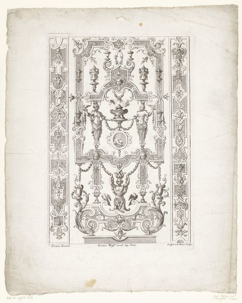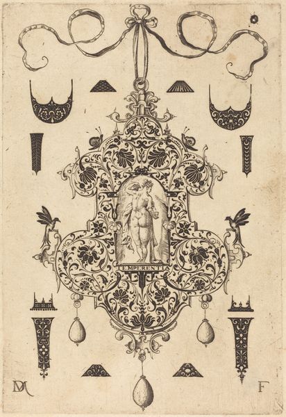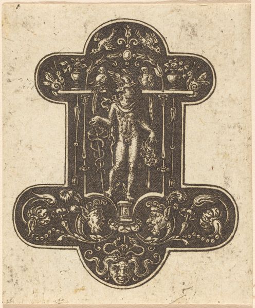 Curator: This engraving is titled "Mars," created by Etienne Delaune. It's a striking print that exemplifies his skill in ornamentation and figural work. What are your first thoughts on the piece? Editor: The precision is captivating. Look at the sheer labor involved, etching all these details to depict both martial power and decorative flourish. The whole thing seems to be a study in the tools and technologies that go into producing images, no? Curator: Absolutely. Delaune was a master of his craft, renowned for the meticulous detail and ornate style he brought to these prints. "Mars," likely intended for use by other artists or artisans, demonstrates the cultural fascination with classical themes and the aesthetic ideals of the time. You know, disseminating these styles so they are accessible for others' productions? Editor: You see how Mars stands centrally framed between what look like letter forms? What do you make of this ornamental approach to representation? The image isn't merely depicting Mars; it's presenting the very *idea* of Mars through constructed form, if that makes sense. Curator: It makes perfect sense. It speaks to how cultural concepts get shaped by those crafting images. We need to acknowledge how printmakers like Delaune wielded considerable cultural power by distributing those archetypes throughout society. These images would’ve circulated through various workshops and studios. Editor: Precisely. This wasn't just art for art's sake; it served a functional purpose, contributing directly to the material culture. Someone reproduced this image in another medium whether through metalwork, embroidery, and beyond. It's all about how material means mediate what is worth circulating or not in culture, I suppose. Curator: Reflecting on our conversation, I find it fascinating to consider the long chain of hands that contributed to both its creation and influence in society. Editor: Right? A perfect lens to view cultural production not only as artistic endeavor but a complex system of skilled trades, commerce, and dissemination, from initial design all the way through later use.