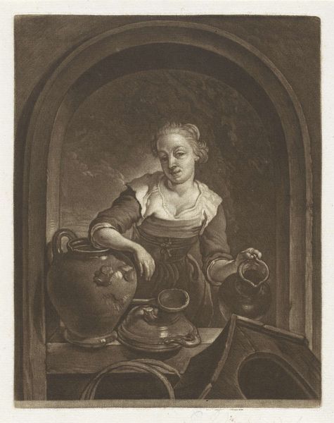 Curator: This is Louis Bernard Coclers’ "De ketelschuurster," created around 1780. What strikes you about it? Editor: It feels quite intimate, almost a captured moment. The light gives it a certain…domestic realism. There’s a stillness to it that is quite captivating. Curator: I find Coclers’ technique compelling. Notice the cross-hatching, the layering of lines that build form and shadow. The work with pencil suggests tonal variation and volume. The texture feels remarkably complete for what we understand is "light pencil work". Editor: Indeed. The tub she’s cleaning…the lines suggest a never-ending task for some. Consider the cultural implications; in domestic labor, cleaning often bears deep symbolism. This suggests duty, or purity, doesn't it? It also underscores societal expectations imposed on women, reducing them to the repetitive and unsung tasks of housekeeping. Curator: I can see that, but it’s also about geometric order. The square window frames the curves of her body, and the cylinder of the tub echoes her rounded features, almost reflecting light back on itself. Editor: Perhaps. And the window acting as a threshold, mediating the private indoor life and the outside world. It symbolizes limits, both physical and metaphorical, faced by women in that era. Curator: It is, in the purest form, art about representation. The window provides an internal picture frame allowing light, direction and, quite frankly, order to come to the forefront. Coclers’ attention is really about spatial relations on a micro level. Editor: I do see it. What initially appeared as a humble domestic portrayal now reveals itself to be loaded with commentary on gender roles, perhaps even challenging our notions of historical agency through its portrayal. Curator: Well, it goes to show how visual formalism can reveal, layer by layer, a deeper narrative. Editor: Absolutely, offering pathways into history we may not have initially appreciated.