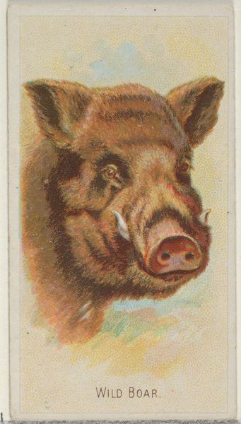 This is a lithograph of a hyena, part of Allen & Ginter’s “Wild Animals of the World” series of cigarette cards. The image, though small, captures a vivid scene. Note the hyena’s focused gaze and the bone it clutches, rendered with a stark, almost unsettling realism against the softer, dreamlike background. The composition is deceptively simple, yet the hyena's dominant presence and low angle shot create a sense of confrontation. The lithographic technique is significant here. The fine, almost pixelated texture allows for a subtle gradation of color, enhancing the three-dimensionality of the animal. The moon in the background, along with the stark contrast between light and shadow, evokes a sense of nocturnal drama. The hyena's eyes and teeth create a point of focus. The card's format, meant for mass consumption, turns this depiction into a sort of spectacle. It draws us into a semiotic game, where ideas of nature, culture, and consumerism intersect.