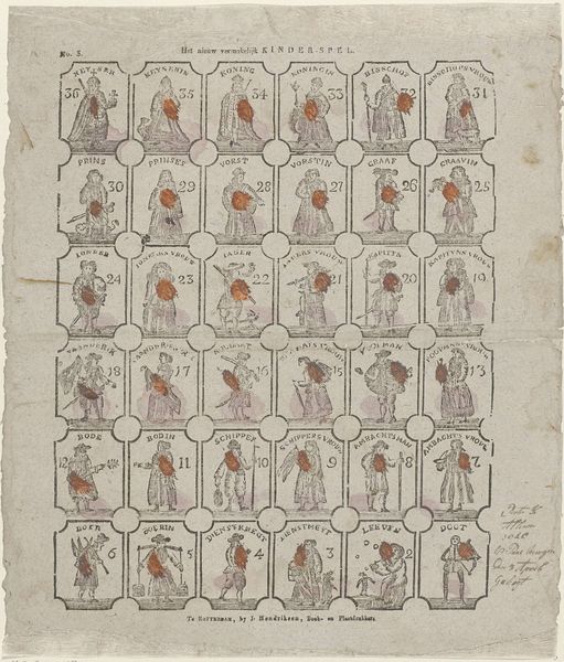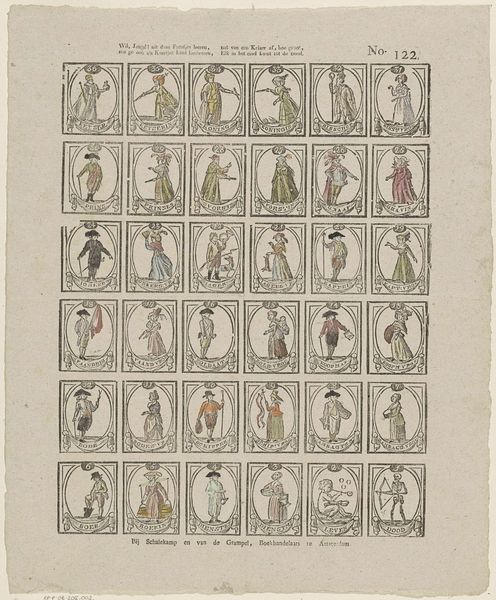 Curator: Before us, we have "Hier ziet gi kinderen weer een stoet, / Het zijn soldaen vol van moed," a print and drawing, or more precisely, an engraving by W. Thompson, dating from between 1835 and 1837. What is your initial response to it? Editor: The organization of space into neatly labeled rows strikes me first, almost like a catalog. A restricted palette focuses attention on subtle shifts in the posture and gesture of these miniature soldiers. Curator: These soldiers, presented in a grid, highlight the militaristic fervor that was prevalent during periods of nation-building in 19th century Europe. There’s a glorification of military life here but within what context was this artwork made and for whom? Editor: Visually, it’s quite clever how Thompson uses the confines of each frame. Note how each individual figure is depicted in a slightly different position or with different armament. The subtle alterations creates movement throughout the entirety of the composition, transforming the individual cells into something more akin to a single moving frame. Curator: Indeed. Looking beyond the visual aspects, I’m also thinking about the title, which roughly translates to, "Here children, you see a troop / They are soldiers full of courage". Considering Thompson addresses the viewer directly and includes “children," might indicate this artwork may be intended to indoctrinate young minds, glorifying service as something brave and noble? Editor: Interesting proposition. While acknowledging the possibility, I’m still leaning more towards the structural integrity here. The figures may be posed as a form of a typological study; in the manner one might expect in the field of natural science rather than military propaganda. Each posture methodically presented and classified. Curator: I find your focus solely on form rather limiting here! It's hard to ignore the social, and potentially pedagogical functions this image had! Nevertheless, a fascinating discussion! Editor: And one that is clearly best taken to the library. Shall we?
