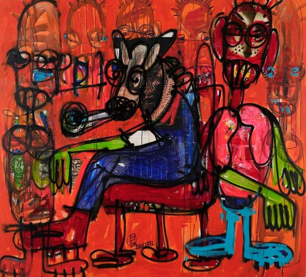 Editor: Here we have "Estátua de Fernando Pessoa Autor Desconhecido," painted in 2003 using acrylics. It's…strange. The figure is so simplified and the colours are really clashing. How do you interpret this work? Curator: Indeed. It's certainly not a traditional portrait. Let's consider its formal qualities. The artist employs a limited palette dominated by muddy reds and blues, creating a disharmonious, perhaps even unsettling effect. What do you observe about the application of paint itself? Editor: It looks quite rough, almost naive. There's no real blending or subtle shading, it’s very direct. Curator: Precisely. This immediacy draws our attention to the materiality of the paint, its texture and viscosity. Furthermore, the simplified figuration removes any sense of traditional representation. Note how the contours are heavy, and black. This contributes to the overall flattening of the picture plane, challenging any illusion of depth. What does the image remind you of? Editor: It makes me think of primitive art but a touch Fauvist in its boldness, I guess? So, are you suggesting the painting is deliberately unsophisticated to focus on form and colour? Curator: In a formalist reading, yes. We move away from biographical elements. We find artistic significance through the internal workings of colour, form, line, and composition. Editor: I never really thought of looking at a piece this way. That you can pull away at a single brushstroke instead of looking at the bigger picture to get more value. Curator: It offers a different way of engaging with visual language. By doing this, the value is increased as different views and opinions clash and collide!