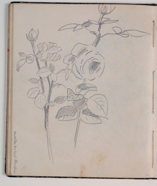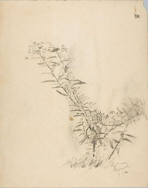 Curator: Today we are observing "Plantestudie" or "Plant Study" by Niels Larsen Stevns, completed between 1930 and 1936. The work is a pencil drawing currently held at the SMK, the National Gallery of Denmark. Editor: Immediately I am struck by its unassuming charm. The soft pencil lines evoke a feeling of fragility and quiet observation, like a page torn from a naturalist’s notebook. Curator: Note the compositional choices. The artist presents two distinct renderings of plant life: a spare, linear stem to the left and a more lush, flowered vine cascading on the right. It creates a striking contrast, no? Editor: Absolutely, but there is also a delicate symbolism at work here, if you'll indulge my perspective. To me, the skeletal plant form alludes to the harsh realities of nature—dormancy, death—while the flowering vine embodies life's ephemeral beauty, suggesting resilience and renewal. Curator: A plausible interpretation, given the subject matter. It could be further be said that the variations in pressure applied by the artist informs the tonality to lend weight and volume in areas where a heavier concentration is needed, whilst letting other features gently recede. It would appear the negative space is just as considered as the plants themselves, it is rather sculptural. Editor: Precisely! And on closer inspection, the blooms are highly suggestive of rosebuds, an archetype often associated with beauty, youth, and also transience. They whisper to the transient nature of these very things. The shadow hatching lends weight to this theory, like the ticking of the clock. Curator: The deliberate arrangement certainly reinforces the organic quality. Despite the lack of color, there's an undeniable sense of depth achieved through meticulous hatching. It's a masterclass in economical expression! Editor: And in communicating an emotional register. One might see a vanitas theme rendered without explicit objects typically present in vanitas paintings. I find this tender observation deeply contemplative, wouldn't you say? Curator: It allows the viewer room to ponder these natural motifs, in a state of constant becoming. It has indeed been a pleasure to look closely at this work, bringing together observations both material and emotional. Editor: Agreed, and a reminder of how much symbolism nature itself embodies, often escaping our notice!