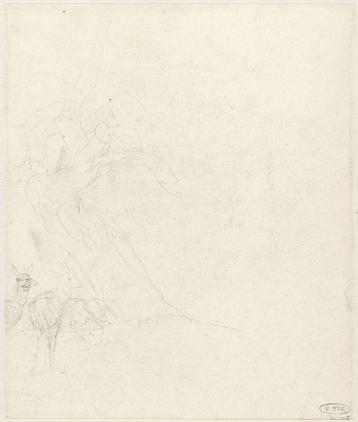Curator: Victor Müller's drawing, housed here at the Städel Museum, depicts "Der Hadesrichter Minos zeigt Dante und Vergil die im zweiten Höllenkreis im Sturm umher gejagten Wollüstigen, unten rechts Francesca und Paolo." A mouthful, I know, but quite descriptive! Editor: Immediately, I'm struck by this ghostly, swirling chaos. It's all soft pencil lines, barely there, yet it conveys such a feeling of restless torment. Curator: Absolutely. We can observe here how Müller uses the pencil medium, the subtle variations in pressure, to craft a Romantic vision of Dante's Inferno. Look closely at the paper, the layering of marks, the almost feverish energy… this speaks to a whole tradition of preliminary drawings in art production. Editor: I like how the lightness almost undermines the horror, or perhaps enhances it. Like a bad dream you can’t quite grasp. The figures are caught in this ethereal storm, just wisps of bodies. Do you feel a certain detachment, though, viewing something so raw and preliminary? Curator: Well, what constitutes ‘finished’ is very much tied to artistic and social context, isn't it? Sketches such as this give insight into the artist’s process; into the very labour of creation often concealed by the polish of completed works. Editor: You're right. It’s about embracing the imperfect, the journey rather than the destination. These whirlwind strokes are somehow loaded with feeling – this reminds me of some raw personal angst trying to find an expressive outlet. I wonder about Müller's emotional state while making this? Curator: The social realities of artistic production played a key role. Müller was engaging with and redefining history painting, a significant area of artistic labour. His technique may appear spontaneous, but it is cultivated through training, discipline, and conscious manipulation of his materials within a specific artistic infrastructure. Editor: So even this tempestuous sketch bears the traces of industry, of the commerce around making images. Knowing all that gives this glimpse into Dante's world another, colder dimension. Curator: Precisely. Now, that helps us to view a drawing like this not only as an aesthetic or expressive creation, but a material record deeply enmeshed with its time. Editor: Beautiful. From restless ghosts to the means of making them, our perspective has changed quite dramatically today.