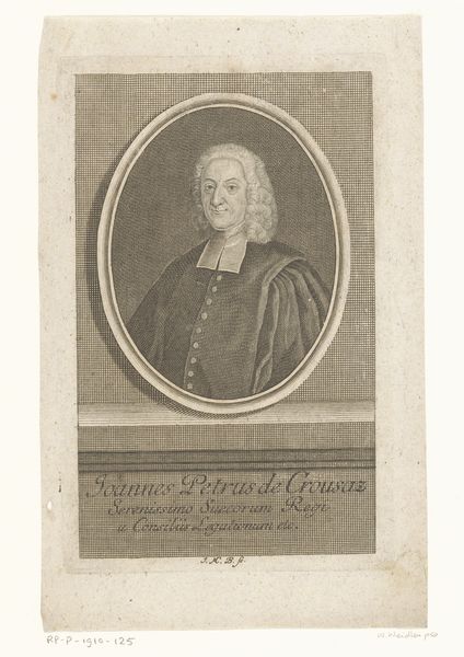 Editor: Here we have Johann Martin Bernigeroth's 1735 engraving, "Portret van Johann Frick," currently at the Rijksmuseum. The aged paper and the intricate lines of the engraving give it a really dignified, almost solemn feel. What do you see in this piece, and how would you interpret its visual language? Curator: The visual language speaks volumes about status and identity in that era. Notice how the oval frame within the rectangular format emphasizes the sitter's face, drawing our eyes immediately to his expression. Consider the deliberate choice of rendering Frick in the attire of his office. How does clothing operate as a signifier here? Editor: It makes him seem important, respectable...a man of the church, given the inscription, I presume. The way the light falls on his face adds to that impression, maybe. Curator: Exactly. Light and shadow play a significant role. Think of it less as simple illumination and more as symbolic highlighting. Light, traditionally, is connected with enlightenment, truth, and divinity. What does the steadiness of his gaze convey to you? Editor: I'd say confidence, intelligence maybe. A sense of self-assurance. Curator: And that confidence is not accidental. It's cultivated through visual cues deeply rooted in cultural understanding. Consider the inscriptions - a claim to his accomplishments. It's all working to solidify his legacy, to cement him into a specific historical narrative, really controlling cultural memory. Editor: So it’s less about simple representation and more about constructing an image, a lasting symbol? Curator: Precisely! These aren't just portraits, they're carefully constructed icons meant to endure and communicate specific values to future generations. I now see how impactful images were in crafting specific narratives and remembering figures through symbols and the conscious choices around composition and dress. Editor: Me too. The choices regarding what to show and how really define the enduring story of this man, and how we continue to perceive him today.