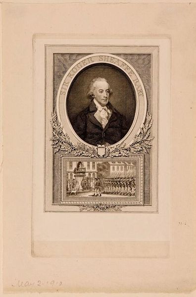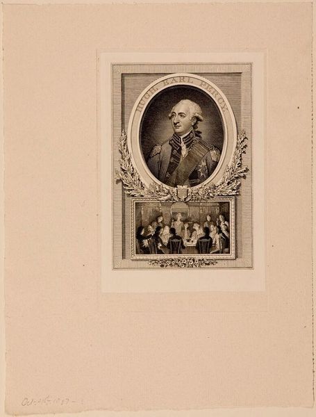Editor: This is Sidney L. Smith’s "Earl Percy Hugh." It seems to be an etching or engraving. The portrait and the scene below feel very separate. How do you interpret this work, especially considering the materials used? Curator: The choice of etching, a process demanding meticulous labor, speaks to the social context of portraiture. The division highlights class disparity; the Earl’s isolated image contrasts with the collective labor possibly benefiting from his status. Notice how the materials and labor are intrinsically linked to societal power. Editor: That’s a fascinating point. I hadn’t considered the labor involved in the etching as a commentary on social class. Curator: Considering the means of production reshapes how we view not just art, but the society that produces it.