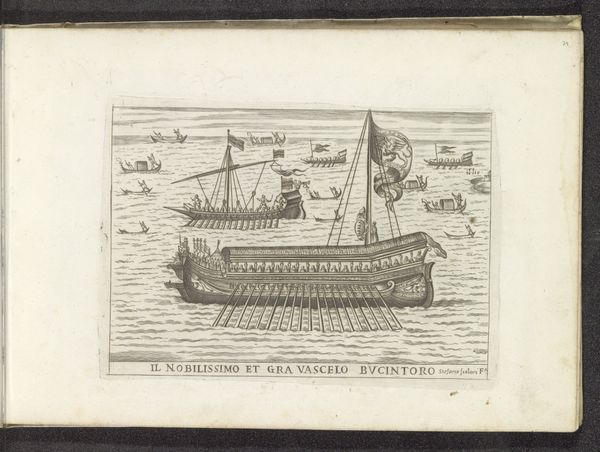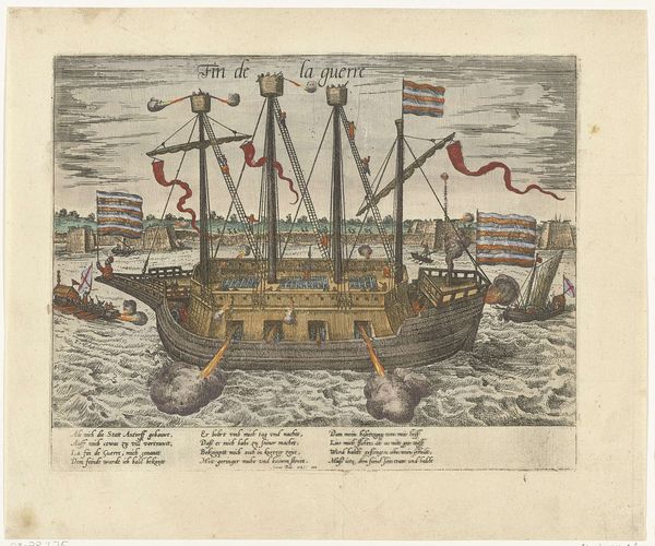 Curator: Here we have "Het schip Fin de la guerre, 1585," or "The Ship, the End of the War, 1585" an engraving crafted circa 1587-1591 by Frans Hogenberg. It’s currently held in the Rijksmuseum's collection. Editor: It's a busy scene! All that detail rendered in simple lines; I’m struck by the energy of the piece. The ship is blasting away, quite violently I might add. Curator: Indeed! This work acts as a piece of historical narrative, reflecting the turbulent late 16th century in Europe. The title, "The End of the War", while appearing optimistic, must be read within its sociopolitical setting. The religious and political conflicts raging throughout Europe are important when considering the significance of this ship as a symbol of both hope and unresolved tension. Editor: Considering it's an engraving, I find myself focused on the marks. Notice how Hogenberg uses hatching to create the illusion of volume in the sails, and texture in the water. This demonstrates the labour intensive approach of the printing. There’s also an inherent commentary on production methods through its wider accessibility to a viewing public. Curator: Absolutely, and the print’s materiality allows for wider dissemination, effectively influencing public sentiment, wouldn't you agree? It allows discussion around class, around access to visual rhetoric, and power. This distribution also has considerable relevance, when the rise of the printing press transformed modes of social critique. Editor: This readily available paper form of art really drove accessibility beyond elite circles, shifting perception, no question. By its construction, this print makes a subtle statement regarding accessibility of artmaking and knowledge at the time. Curator: Examining Hogenberg's print, one must remember that depictions of naval power carried strong ideological weight. Its layered representations highlight the war as a catalyst for reshaping geopolitical identities. Editor: For me, looking at it this way, it underscores the transition of craft into industrial manufacture with printing, transforming image consumption. This gives insight into a time when commodities’ material presence shaped understanding. Curator: Yes. This work certainly challenges traditional, patriarchal narratives by highlighting shifts in European socio-political structures. Editor: The level of detailed inscription combined with material realities surely does complicate ideas of how craft shapes and reflects identity, power, and a move toward commodity culture in art.