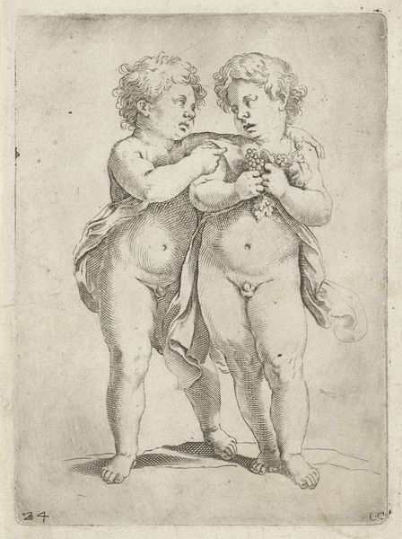 Curator: This is "Bacchanaal van kinderen," attributed to Lorenzo Loli, dating from 1622 to 1691. It's an engraving currently residing here at the Rijksmuseum. Editor: It's giving me tipsy cherubs! There's such a sense of… indulgent mischief in those lines. Like a party where nobody invited the grown-ups. Curator: The line work is indeed quite striking. Note how Loli uses varied densities of hatching to suggest volume and light on the figures' skin and the surrounding objects. It emphasizes the baroque style—dynamic movement, rich details—though rendered with simplicity in a monochrome palette. Editor: And the composition! A tipsy, reclining child, guzzling directly from a small barrel held up by his pal… it feels very irreverent. It makes me wonder, is this about more than just drunk toddlers? Curator: The reference to Bacchanaal does invite consideration of classical themes—wine, ecstasy, liberation from inhibitions. These putti embody unrestrained joy. Considering the period, it could be viewed as a subtle commentary on societal constraints through a historical lens. The children are free. Editor: Yes, but those aren’t normal kids – they’re little gods. Look at that child sprawled out—a future Bacchus, maybe? Drunk on immortality or simply a touch too much grape juice? It tickles me, this image. The scene almost makes you feel like laughing along with them Curator: I can see how its immediacy appeals. However, the artistry of this engraving lies beyond the immediately mirthful scene depicted. It is important to view the careful articulation of form and utilization of line that truly exemplifies Loli’s skillful interpretation of a classic genre. Editor: Art has to do both – to make you think and to make you feel. This does both. If art does both, isn’t that more important than showing an audience, Curator, the method and materials used to make it? Curator: Articulation of artistic process is key to proper analysis. Nonetheless, you raise an intriguing point; perhaps art exists when theory intersects emotion. Editor: I couldn't have put it better myself! So let's leave people with that and maybe come back later with a bottle for further debate. Curator: Perhaps not on duty. However, a fascinating proposal to contemplate, all the same.