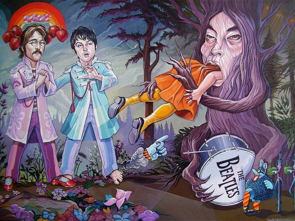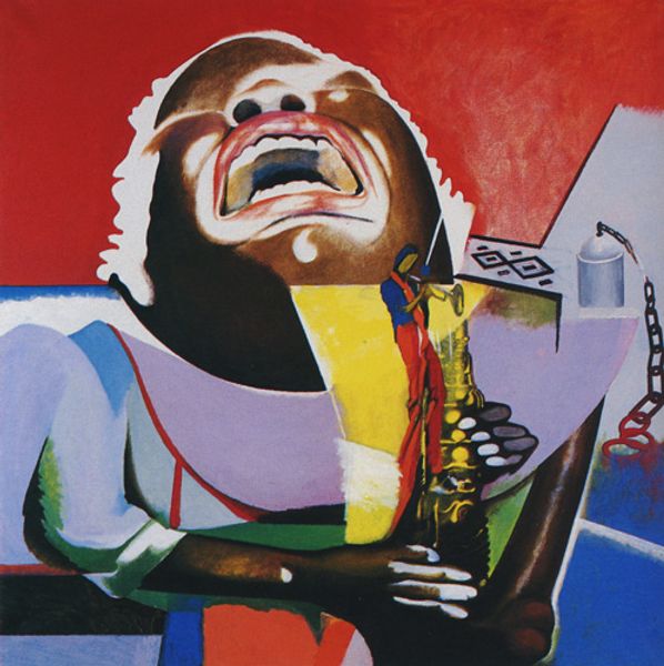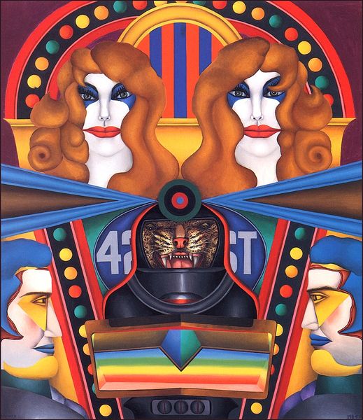 Curator: Dave MacDowell created this visually arresting acrylic painting titled "Snortin’ Whiskey – Drinkin’ Cocaine” in 2010. Editor: Wow, a sensory overload! My first thought is "texture"—there’s so much detail crammed in, from the city skyline to the figure's clothing. It almost feels like a collage, demanding close inspection. Curator: It absolutely layers iconography to probe some very uncomfortable aspects of society. Think about how the "Baby Momma Drama" headpiece frames the subject's face, or the brand names floating around. What narratives do you read into those? Editor: Right, the layering speaks to a constant accumulation of visual culture—drugs and capitalism being manufactured. Then the "Baby Momma Drama" crown – I immediately key in on it being a critique of motherhood as labor and branding, even. How does the chosen medium add to this dialogue for you? Curator: Acrylics provide a great degree of blending, a characteristic this artist employs in interesting ways here. But in this context of the hyperreal it amplifies the way these different signifiers collide and conflate ideas about desire and control. There's even TNT on the ground plane, threatening an explosion! Editor: Indeed, I read that volatility, almost a forced proximity between high and low cultural icons, which can be read throughout the history of image consumption. Those syringes on the guitar certainly raise an alarm on accessibility. What did MacDowell wish to impart here? Curator: MacDowell does not give any easy answers, nor a distinct moral edict. But placing recognizable brands within an otherwise bleak setting calls us to understand them beyond simple consumption. These items take on new meanings here. Editor: That checks out! I came here expecting a gritty urban commentary, but walked away seeing commodities deconstructed through color and iconography. Curator: Absolutely, seeing as these narratives are inherently social! Even the concept of identity plays a role as commodity here. The medium gives material substance to otherwise hard-to-understand constructs.