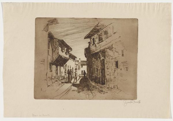 Curator: Whistler’s "Liverdun" presents a small French townscape rendered in delicate etching. Editor: There’s a quiet stillness to it. The lines, so sparse, almost vibrate with sunlight. Curator: Whistler was greatly influenced by Japonisme, evident in the asymmetrical composition and emphasis on tonal values over precise detail. His printmaking helped disseminate aesthetic ideas in the late 19th century. Editor: I agree. The composition's simplicity and the artist's strategic use of blank space guide the eye, echoing the influence of Japanese ukiyo-e prints. The buildings, though, seem to fade as the eye is pulled towards the center. Curator: And consider the social context. Whistler aimed to elevate printmaking to the level of painting, challenging academic hierarchies and democratizing art. Editor: I see how the artist's decision to work in this medium reflects his broader artistic and political views. I leave this work now with a renewed appreciation of this artist and his skill.