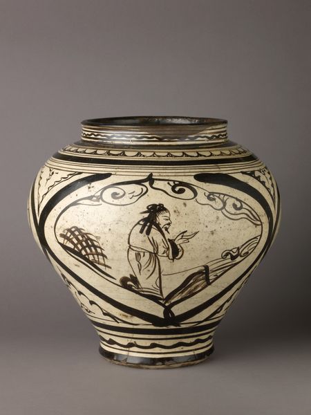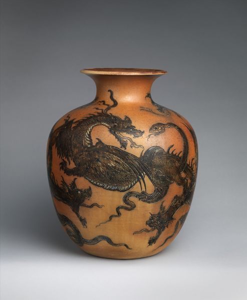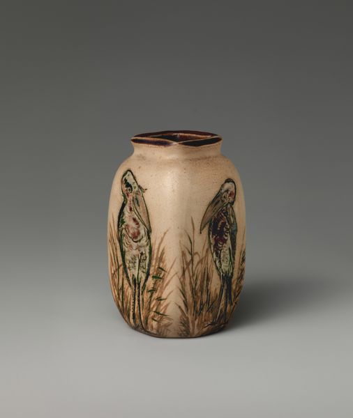 Curator: R. W. Martin and Brothers created this "Bottle vase with birds" in 1899. It's a ceramic stoneware piece here at The Metropolitan Museum of Art. Editor: My first impression? A bit melancholic, like a Victorian taxidermy display but rendered in clay. The palette, with that faded ochre, is muted, yet there’s an almost cartoonish boldness to the etched birds. Curator: Indeed. Observe the vase's structure—the squared-off lip contrasts sharply with the otherwise organic, tapering form. This juxtaposition creates a tension that is echoed in the relationship between the textured body and the smooth, linear drawings. Semiotically, the bird motif here is important. Editor: Absolutely. Those aren't just any birds, are they? They appear to be… captives? I'm seeing such incredible detail: etched lines capture every feather, even a chain wrapped around its leg! Are we meant to ponder themes of freedom versus restraint? Curator: It’s a fair reading. The subdued coloration serves to foreground the incised drawings. These birds, almost grotesque, invite interpretation through a social or political lens. It also reminds me a bit of some of the work of Honoré Daumier. Editor: There's also something quietly subversive about presenting such raw, ungainly birds on a vessel that, functionally, implies delicacy and refinement. You know, like serving wild honey from a skull. It has a very William Blake feel, don’t you think? Curator: Perhaps. This interplay is typical of decorative art from this period. The application of high artistic skill towards everyday objects provokes intriguing social questions through both material and form. The function is aesthetic rather than utilitarian. Editor: This piece almost seems like an outsider artist’s interpretation of high-end ceramics—there is a playful crudeness that undermines formality. But the craftsmanship—wow. You could get lost in the texture of the ceramic alone. Curator: Yes. A testament to the period. I found myself studying just the gradation from pale top to the orange tones around the base. Well, I do think this conversation has illuminated quite well some complex attributes of this fascinating piece. Editor: For sure. Every time I gaze into its stony eyes I find something new in this odd, sad little avian. Its beauty certainly lingers, doesn't it?