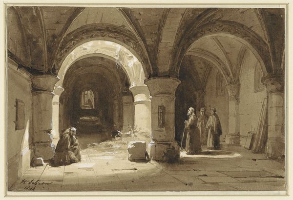 Editor: So, here we have Johannes Bosboom’s "Interieur van de Grote of Andreaskerk te Hattem," made in 1851, using ink, watercolor, and charcoal on paper. It's striking how he's captured the vastness of the church with such delicate materials. What captures your attention in this piece? Curator: I'm immediately drawn to the evidence of process – the layering of ink and watercolor, the visible charcoal under-drawing. It points to the labor involved in its creation. These choices of relatively inexpensive materials like paper, charcoal and ink tell us something, too. It wasn't made with precious materials like expensive oil paint or marble. How does this inform our reading of the work? Editor: That’s interesting. I hadn’t considered the choice of materials so deeply. Does it perhaps speak to the accessibility of art at the time or maybe to a shift in artistic values? Curator: Precisely. Bosboom was working in a period where the relationship between art and labor was being questioned. Churches were still prominent centers of European society. So how might he be reflecting both on religious institutions and broader economic changes within Dutch society? Editor: Thinking about the labour, the ink and watercolor medium allows for faster execution compared to oil, enabling potentially more commissions and works made. The quick execution of materials suggests both efficient production and his perception of art labor! Curator: Good point! Also note that Bosboom emphasizes a 'realism' approach – what are the politics of representing everyday subjects? This could challenge traditional notions of "high art." What do you take away from considering it this way? Editor: I never thought about art as a product of labour so concretely, but it's fascinating how focusing on the materials and means of production can open up entirely new avenues of interpretation. Thanks! Curator: My pleasure! I'm glad we could think critically together!