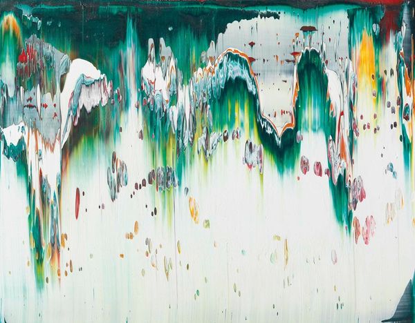 Editor: This is Gerhard Richter’s "A B, Tower," created in 1987 using mixed media. The colors—green, red, silver—seem to drip down the canvas. It feels… turbulent. What do you see in this piece? Curator: This work, created in the late 80s, sits within the context of Neo-Expressionism, a movement that valued subjective experience and raw emotion. It's easy to read this piece formally: the layered paint, the visible process. But how do we interpret that expressiveness politically, given that Richter often deliberately obscures meaning? Editor: Politically? I hadn't thought of that. I was just focusing on the brushstrokes, the colors. Curator: Consider the materials, the acrylic, the *application*. Is there a commentary on consumerism or perhaps an exhaustion with grand narratives, reflected in this act of deconstruction on the canvas? Richter created this work during a time when Germany was still grappling with its past, but also looking ahead. Do you think abstraction allows for, or maybe even demands, a certain critical distance from historical events? Editor: Maybe the abstraction allows viewers to project their *own* meanings onto it. Curator: Precisely! And those projections, conditioned by our own cultural moments, reveal more about *us* than perhaps about Richter's specific intent. This constant push and pull between artist, artwork, and viewer – that's where the real dialogue lies. Editor: So it's not just about what Richter was thinking, but also what *we* bring to it. I will definitely look at abstract art with a new perspective. Curator: Art becomes relevant when you realize that the political exists not only within explicit subject matter, but also in its aesthetics and form.