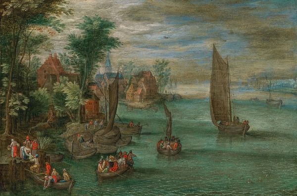 Editor: We're looking at "A landing stage near a village with shipping and figures" by Jan Brueghel the Younger, created around 1600, using oil paint. It's incredibly detailed; you can almost hear the bustle of the village. What strikes me is how the artist uses the boats to create a sense of depth. What do you see in this piece? Curator: I see an excellent example of early Baroque composition, cleverly employing line and plane to organize pictorial space. Notice the interplay between the horizontal plane of the water and the verticality of the sails and trees. Brueghel’s delicate brushwork renders the details of daily life with a captivating realism, a signature element of genre painting from the Dutch Golden Age. Observe how he divides the canvas into distinct zones using shifts in color saturation and texture to create depth, guiding the viewer's eye through the landscape. Editor: So the color is working to guide the eye as much as the boats and lines do? Curator: Precisely. The muted, earth-toned palette in the foreground contrasts with the cooler, atmospheric blues and greens in the distance. This pushes the horizon back visually, further accentuating depth. Consider also the relationship between the size and placement of the figures; they are systematically arranged to maintain balance and proportional harmony across the pictorial field. How does that balancing impact your understanding of the piece? Editor: I hadn't noticed that. It brings a certain…stability, I guess, to what looks like a busy, active scene. I see the balance of the foreground to background, how all of the textures, hues, and scales relate to one another in discrete zones to create a harmonic field. It's so balanced and calm and detailed. Thank you. Curator: Indeed, the systematic formal arrangement belies the dynamism of the subject. A worthwhile discovery, wouldn't you agree?