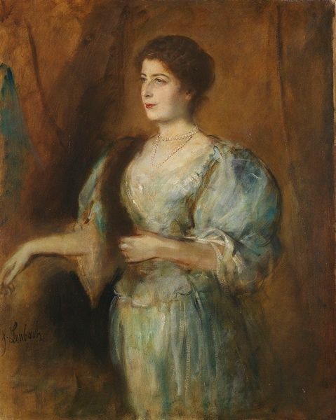 Editor: Here we have Franz von Lenbach's "Portrait of a Young Lady," probably painted between 1870 and 1880, done in oils. It’s a rather subdued piece, tonally, but there's something arresting about her gaze. What jumps out at you when you look at it? Curator: Subdued indeed! The painting has a wonderful moody quality. Lenbach’s impasto technique almost anticipates the impressionists, don't you think? The color palette is quite dark, save for her bright, almost melancholic face, so my eye is instantly drawn to that tension. Perhaps, a bit of light in the dark...Do you get a sense of who this young lady might have been? Editor: That’s a great question. Her expression seems almost wistful, certainly thoughtful. Someone from a comfortable background perhaps, given the dress and what seems like a gold bracelet. Does Lenbach usually paint portraits like this? Curator: Lenbach often depicted members of the aristocracy and wealthy middle class with great psychological depth, not merely for the sake of recording a likeness. Here, the sitter’s interiority seems to spill into the visible brushstrokes, creating a unique blend of inner life and tangible texture, which transcends a conventional academic style. In fact, the lack of idealization or beautification actually serves the painting. Editor: I see what you mean! The lack of idealization brings out the humanity in her. I didn't notice that before. Thanks for pointing that out! Curator: My pleasure! Seeing is a creative act after all, as alive as the day the portrait was painted, I would suggest!