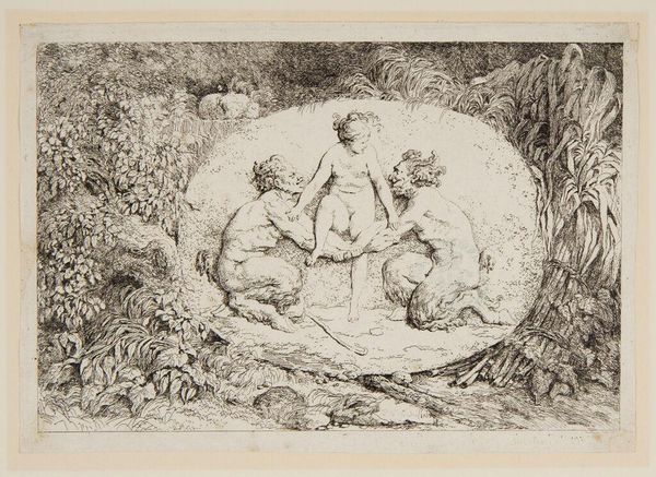 Curator: This is "Plate Two: Satyr Carrying a Nymph on His Back and Led by a Youth" by Jean-Honoré Fragonard. This print work is housed here at the Harvard Art Museums. Editor: Oh, it's wonderfully chaotic! The energy practically leaps off the plate. It's like a stolen moment of pure, unfiltered glee, even if I'm not entirely sure what's going on. Curator: Well, the satyr is a classic symbol of untamed nature, of course. And the youth leading them… it feels like a guide, or perhaps even a symbol of controlled desire. Editor: Perhaps. Or maybe they are just good friends on a frolic! I wonder, does this image hint at a larger story, a myth we've forgotten? Or is it simply a captured instant of pure, ecstatic abandon? It feels… delicious. Curator: That "deliciousness," as you put it, is Fragonard's genius. He captures the lighthearted spirit of his era. It feels both innocent and subtly charged. Editor: I suppose the ambiguity is where the fun lies, isn't it? A dance between order and chaos, desire and innocence. Now I'm left wondering where they are going… Curator: A journey for the ages, if you will, through Fragonard's playful imagination.