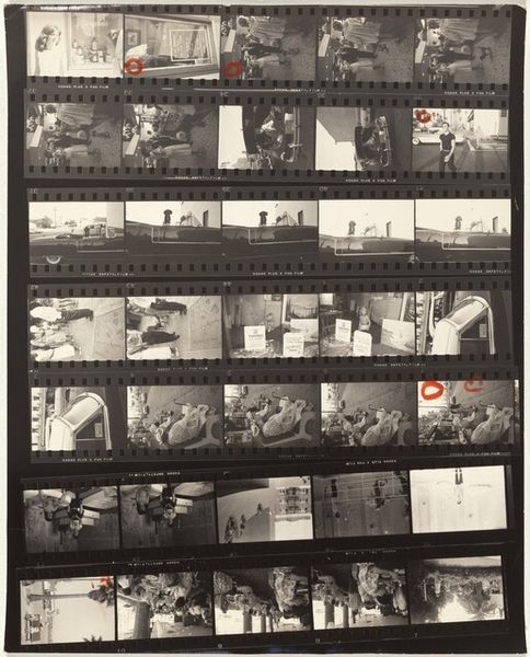 Editor: We're looking at "Paris 54A," a gelatin silver print by Robert Frank, taken between 1949 and 1950. It's essentially a photographer’s contact sheet. What strikes me is its intimate feel, like glimpsing into a private sketchbook. How do you see it? Curator: Ah, yes! A sketchbook spilled out for us. Robert Frank… he grabbed moments. Not grand pronouncements, but those sneaky little nothings that whisper the truth. For me, a contact sheet sings of choices, possibilities, the sheer gamble of seeing. What leaps out to you? The blurry ones? The posed? That odd one with the graffiti? Editor: It's a mix, right? I like the street scenes and the market pictures; but that red mark, is that the artist editing the roll of film or doing some after-the-fact work on the photograph? Curator: Exactly! He is speaking his mind about the process itself, and what really got his interest when on location... I’d bet that mark speaks louder than any darkroom print he might have made from this roll. Why edit or crop at all when the story is being told, frame by frame, right here on the sheet? What does this choice tell us? Editor: It makes you wonder what was discarded and why. There is even what seems to be an intimate moment, if you follow the roll, and an apparent commercial transaction? Almost a narrative, I suppose. Curator: A silent movie condensed. Robert Frank had a good eye for capturing life’s theatre. This sheet isn’t just a document; it’s a poem about seeing. It invites us into the poet's process, even more powerfully than a final polished print might. Editor: Seeing the artist's selections really brings another dimension, adding layers of choice and meaning I wouldn’t have considered. It goes to show the unedited moment sometimes resonates the loudest. Curator: Beautifully put. Each image a brushstroke and the whole sheet a raw, insightful artwork.