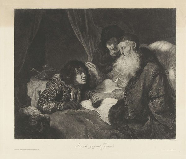 Curator: Standing before us is Jean Henri Marlet’s lithograph from circa 1820 to 1822, titled "See, M. le Maréchal, I am Truly His Mother...". It’s currently part of the collection here at the Art Institute of Chicago. Editor: It’s rendered in earth tones—sepia primarily, giving it a very solemn air. The figures appear to be in a dimly lit room, the scene bathed in a soft, almost reverent light. What’s the narrative here? Curator: The image depicts a scene brimming with historical weight. It's understood that it represents the Duchess de Berry presenting her newborn son, Henri, to a skeptical Marshal. Her pronouncement underscores the legitimacy of the Bourbon line. Editor: Note the placement of the subjects in the composition. The mother and child, the focus, are centrally located and bathed in more light, while the observing officers are pushed to the edges. There's definitely an intended focus created through strategic tonality and contrast. Curator: The image acts as a very specific visual statement about inheritance, power, and motherhood. The Duchess presenting her son serves a deliberate function, quelling doubts about the heir's identity in post-revolutionary France. It reflects a deeply rooted societal anxiety concerning rightful rulership. Editor: Anxiety indeed—there is a discernible tension here. But formally speaking, consider how Marlet used the medium— the lines appear almost sketch-like. What effect did that achieve in your opinion? Curator: This choice actually deepens the emotional complexity of the scene, almost rendering it as a recovered memory, rather than a posed portrait of authority. It makes it feel more immediate. It echoes the turmoil, rather than creating an idealized form. Editor: A persuasive point. It adds an almost documentarian realness. I initially thought the etching felt detached, due to the monochromatic palette and soft execution, but I’m starting to read that aesthetic as deliberately unvarnished. Curator: Absolutely, the apparent lack of grandiosity in execution ironically emphasizes the fragile and contested nature of royal power at that particular historical juncture. The artist chose a visual language of fragility to mirror the historical moment. Editor: This artwork truly underscores the capacity of seemingly straightforward historical representation to operate on multiple interpretive levels. A great image to consider what one brings when "seeing" the past. Curator: Indeed, thinking about the legacy that imagery possesses to reveal complex histories allows a different understanding and appreciation for this era.