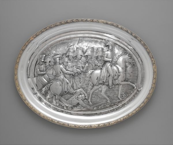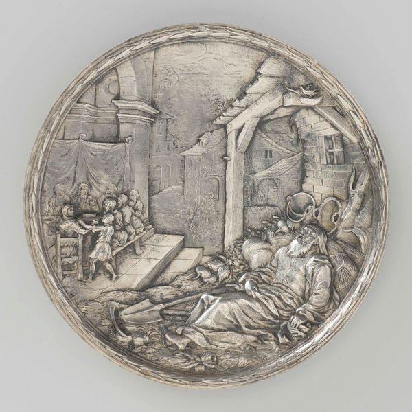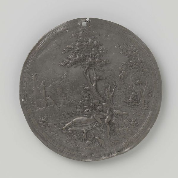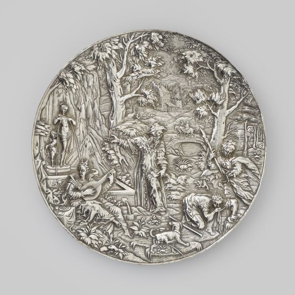 This silver drinking bowl depicting Venus and Adonis was crafted around 1600 by Hans Jamnitzer. The monochrome silver enhances the intricate, almost obsessive detailing of the scene, creating a mesmerizing visual texture. The composition draws the eye into a complex arrangement of figures within a deeply receding landscape. Adonis, spear in hand, is restrained by Venus, their interaction framed by the natural world. This structured arrangement is overlaid with a dynamic interplay of curves and angles, from the figures' poses to the undulating landscape, creating a visual tension that charges the narrative with emotion. The bowl's circular form further intensifies the sense of enclosure and drama, compelling us to consider how Jamnitzer used the constraints of the medium to amplify the emotional and narrative power of his work. The circular composition serves as a microcosm, reflecting larger cultural dialogues about love, fate, and the human relationship with nature.