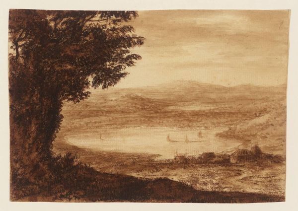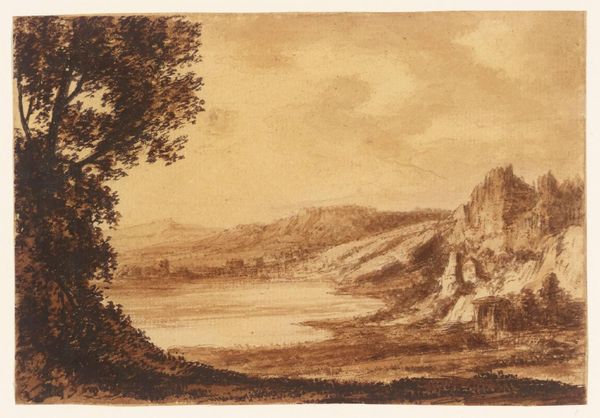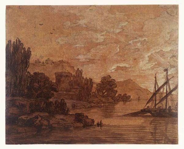 Curator: This is "A Coast Line with Harbour and Promontory, beyond Cliff to Left" by Alexander Cozens, who lived from 1717 to 1786. Editor: It feels a bit like a dream, doesn't it? Sepia-toned, like an old photograph holding onto a half-forgotten memory. Curator: The monochromatic wash emphasizes form and spatial relationships. Note the layering of tones, creating depth within a limited palette. Editor: It's funny, the lack of color makes me focus on the texture, all those little stipples of ink. It feels very alive, even though it's so muted. Curator: Precisely. This work exemplifies Cozens' exploration of the "blot" technique, prioritizing suggestion over precise representation. Editor: You know, looking at it, I can almost smell the sea air and the damp earth. It's so simple, yet so evocative. Curator: A testament to the power of suggestion and the artist's deft handling of tone and composition. Editor: Absolutely, it's like Cozens captured a whole world in this tiny, brown dream.