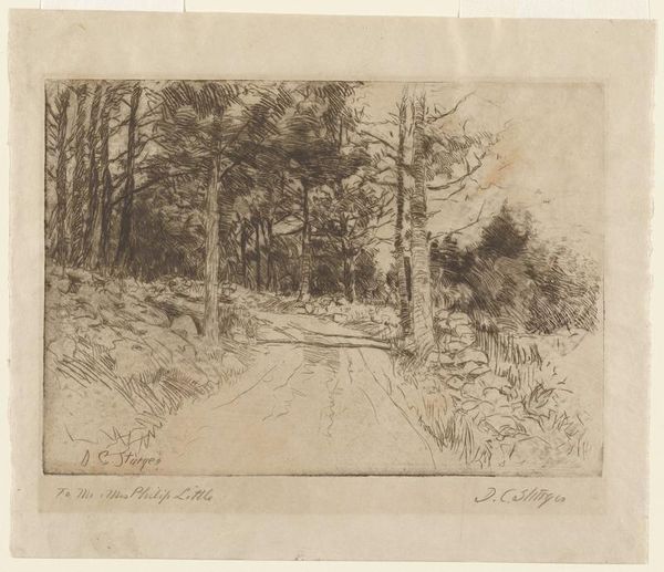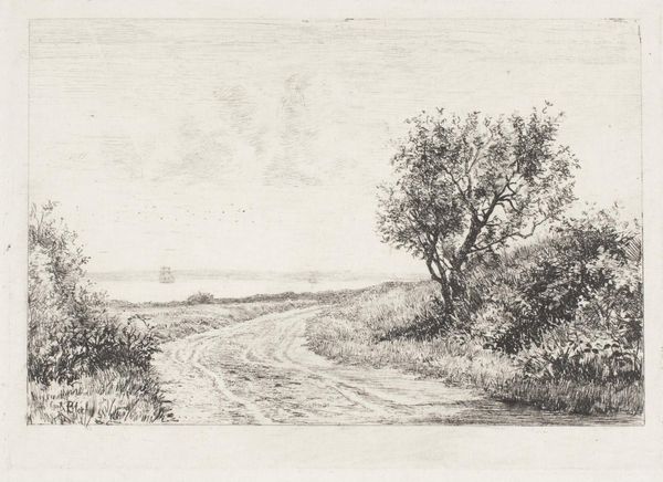 Curator: Here we have Auguste-Louis Lepère's "La route de la Houssoye; Crèvecœur," currently held in the Harvard Art Museums. Editor: It feels vast and empty. The road cuts through the landscape, but there’s a stillness that is quite palpable. Curator: Notice how Lepère uses etching to create texture and depth. The layering of lines, the way he models the sky, it’s all meticulously crafted. Editor: It makes me think about rural life in 19th-century France, the social isolation, perhaps even the economic hardship for many who lived off the land. Curator: A compelling point. Certainly, Lepère’s composition directs our gaze into the distance, suggesting the unknown or perhaps the future. Editor: Perhaps a future where marginalized communities are no longer forced into such a harsh existence? Art can offer a lens to reflect on these realities. Curator: Indeed. The formal elements and the historical context intertwine to offer a multifaceted perspective. Editor: It's a stark reminder that art isn't just about aesthetics; it's about the stories it can tell, the dialogues it can spark.