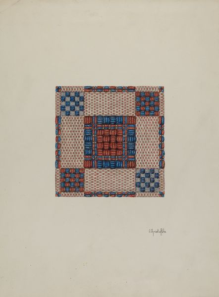 Curator: This is "Coverlet (Section)" by Cornelius Christoffels, made around 1940, employing mixed media and drawing on paper. Editor: The geometry is pleasing, a kind of soft, comforting grid. There’s something almost naive about the drawing; it doesn’t attempt to be illusionistic, yet clearly mimics a woven textile. Curator: Indeed. It offers us a study in contrasting forms and patterns. We can see how Christoffels explores geometric arrangements through color and line. Consider how the artist divides the surface into a structured pattern of squares and rectangles. Editor: Absolutely, and let’s think about what it means to depict something crafted in a wholly different medium. Paper, ink, pencil – how they are being used to mimic the woven. It raises interesting questions about labor, doesn’t it? About valuing craft traditions, even abstractly. Curator: I agree; moreover, how he invokes the language of modernism. One can draw parallels with explorations of non-representational forms pursued by artists seeking to uncover a universal visual vocabulary, with geometric rigor providing that structure. Editor: I also find the texture implied – very unlike the flat surface of paper. One can feel a connection to vernacular crafts. There's a level of intimacy with the hand-made that complicates this seemingly abstract geometric project. It is as if it brings into dialogue ‘high’ and ‘low’ forms. Curator: It invites reflection on the relationships between material, representation, and abstraction. The grid is not just a neutral structure, but also carries inherent meanings, acting as both a framework and a signifier of order. Editor: The fact that it is a ‘section’ intrigues me too. Makes one question where the image may be situated along production or consumption. Curator: Fascinating layers revealed here – order, intimacy, abstraction… It’s been insightful. Editor: Indeed. Makes one value those seemingly humble artistic renderings of utilitarian design.