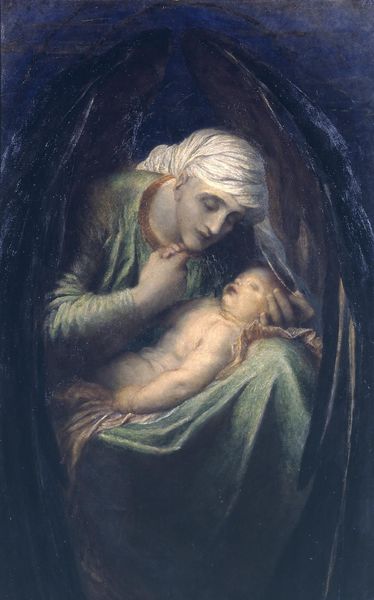Curator: There's such intimacy captured in this work! The lighting seems to cradle the figures… almost as if shielding them. Editor: Indeed. Let’s consider Joseph Wright of Derby’s “Lady Wilmot and Her Child,” created in 1788. It is oil on canvas, though now held in a private collection, unfortunately not on public view. Curator: The swaddling—the drape of the fabrics… they act as a veil. This piece whispers of protection, of new motherhood facing the world’s gaze. Is there more here, historically? Editor: Definitely. Consider the era— late 18th century England. Wright of Derby carved out a unique space, becoming known for candlelight scenes, dramatic narratives of industry. While this image diverges from that subject matter, it still speaks to social ideals. Curator: Because motherhood became an emblem of national identity. Domesticity—the pure, self-sacrificing mother— equated to political stability? I see her elevated… set against inky darkness as if poised between the everyday and some sort of sacred space. Editor: Exactly! This portrayal aligns with wider representations intended to emphasize not only the maternal bond but also virtue within domestic life. Although painted in what many categorize as Romanticism, it also draws deeply on traditions of history painting to imbue this image with weight, suggesting importance beyond a mere likeness. Curator: She appears almost wary… Her alertness as she turns toward us is striking, suggesting the role demands constant vigilance. The dark tonality reinforces her serious air as well, making this less idealised and more a candid recognition of motherhood. It reflects that feeling many have that parenthood has you looking around, ready. Editor: The political implications here should not be overlooked; through representations of mothers from upper classes, moral conduct extended from domestic life directly to national discourse! Wright plays with that, doesn't he? Curator: Absolutely. Editor: Seeing it laid bare now is incredible. Thank you for lending that perspective, it reframes the moment beyond personal love to include its broader sociopolitical resonances. Curator: My pleasure! A fitting piece through which we witness intimacy cast across public memory.