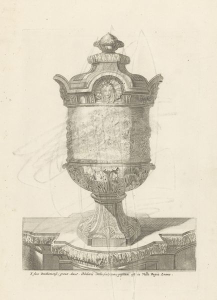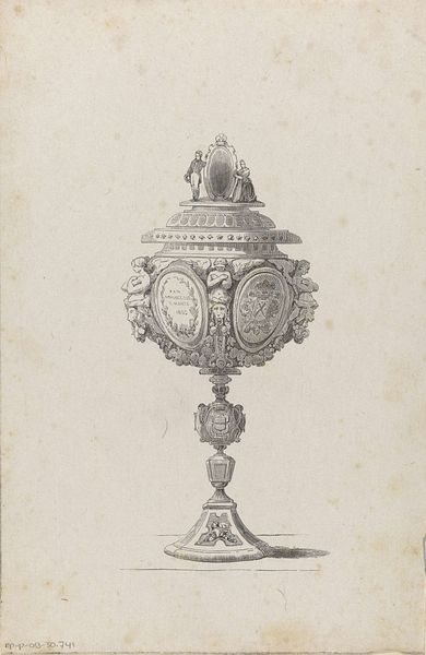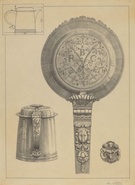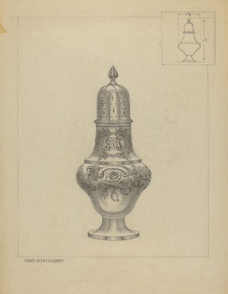 Simon Weiss made this drawing of a Silver Tankard with graphite on paper, sometime between 1855 and 1995. What immediately strikes the eye is the meticulous detail and symmetry of the composition, giving the object a monumental presence. The cylindrical body, crowned with a domed lid, invites the eye to travel along its contours. The design is intricately decorated, featuring classical motifs and figures, set within an oval cartouche framed by ornate flourishes. Weiss masterfully employs linear precision to delineate the object's form. The parallel hatching captures the play of light on the tankard's metallic surface. This drawing transcends mere representation. It is a study in form, balance, and the semiotics of design. The tankard becomes a signifier, encoding social status and refined taste through its elaborate ornamentation. Weiss challenges us to consider the tankard not just as a vessel, but as a cultural artifact rich with historical meaning.