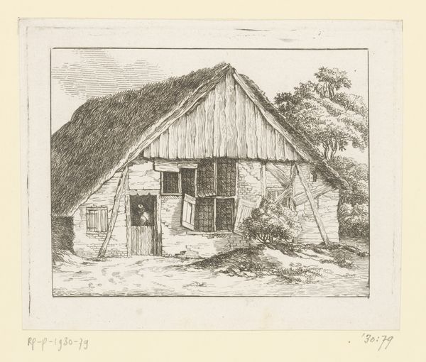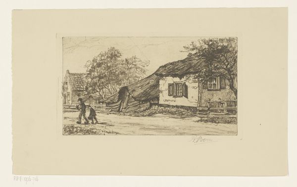 Editor: So this etching, "Zijgevel van een boerderij," or "Side of a Farmhouse," is attributed to Hermanus Josephus Wolff, and its dating is rather broad, 1886 to 1934. It has this really calm, quiet feeling to it. What do you see in it? Curator: The deliberate rendering of a humble, rural scene invites us to consider the romanticized vision of agrarian life often contrasted with the burgeoning industrial era. Think about who had access to idyllic imagery like this during this time. Who was being excluded? Editor: I hadn't thought about that. It seems simple, but what you're saying makes me think about social class and the rise of industrialization. How did people perceive the countryside? Curator: Exactly. The farmhouse isn't just a building, but also an ideal. And ideals can be potent tools for either social critique or the reinforcement of existing power structures. This work reminds us that romanticizing the rural idyll can mask the realities of labor and land ownership. How does the technique, the etching itself, play into this conversation? Editor: It makes me think of the labor involved, compared to, say, a photograph. An etching seems to have more handmade intimacy to it, maybe? Curator: Yes, there is labor. Also, consider the relative inexpensiveness of printed images; could this etching potentially reach wider audiences than, say, a painting? Could Wolff be engaging in a democratizing gesture? Editor: Interesting! So, on the one hand it could be a simple landscape. But on the other, it encourages us to look at the wider politics around it, especially how social class shapes it. Thanks, I will carry that thought process as I view art in the future. Curator: And consider the dialogue between that historical context and our own, where anxieties about urban life persist, prompting a continued revisiting, and often a reimagining, of these very landscapes.